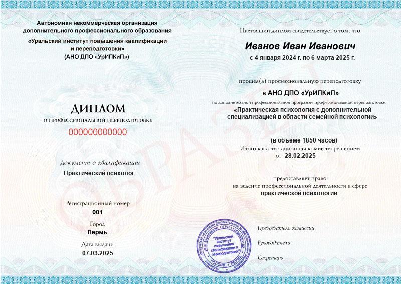 - Образец диплома о профессиональной переподготовке.