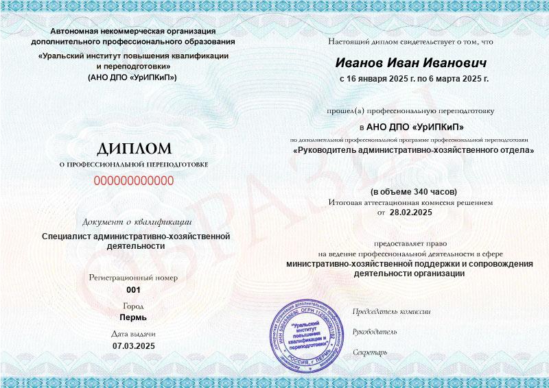 • Квалификация: Специалист административно-хозяйственной деятельности