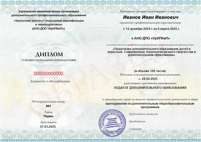 Да, дипломы и удостоверения оформляются в соответствии с действующим законодательством РФ. Документы печатаются на специальных бланках, заверяются печатью АНО ДПО «УрИПКиП».